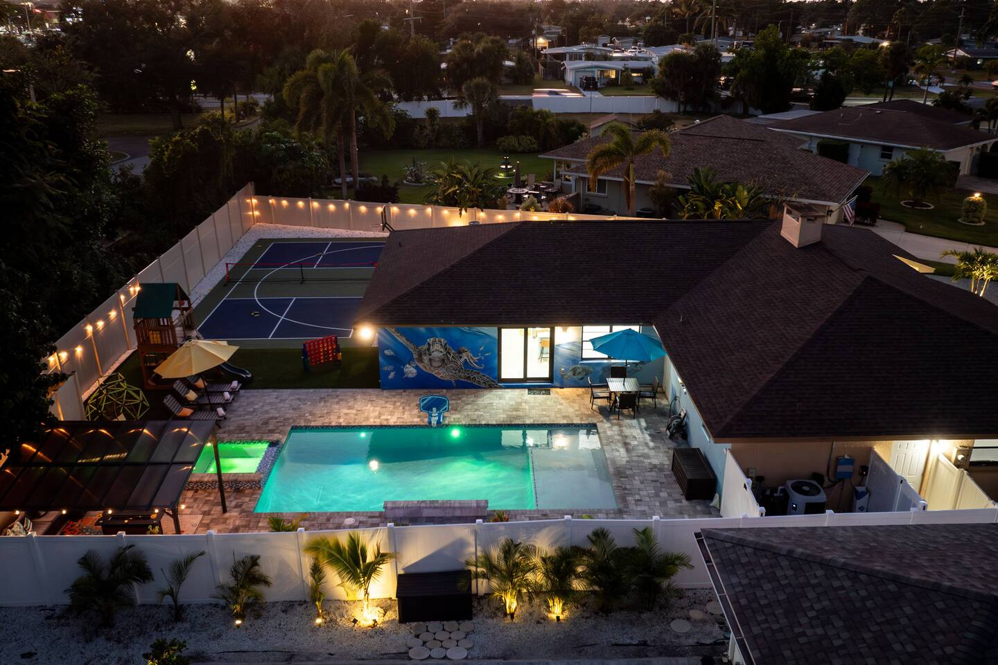 Ultimate Family Retreat with Private Pickleball, Mini Golf & Heated Saltwater Pool Immerse yourself in a world of leisure, fun, and relaxation at our exceptional Bradenton vacation home, perfectly designed for families and groups. Enjoy a game of pickleball on your private court, test your skills on the mini-golf course, or take a dip in the heated saltwater pool and hot tub (optional pool heat available). Lounge under the Florida sun on relaxing poolside loungers or unwind in the shaded gazebo this backyard is pure paradise. Step inside and experience modern comfort meets coastal luxury. The fully stocked gourmet kitchen features stainless steel appliances, quartz countertops, and a large island perfect for family meals, morning coffee, or late-night snacks. The open-concept layout flows seamlessly into the elegant dining area, where shared laughter and memorable moments await. When you’re ready for some indoor fun, head to the ultimate game room, an entertainment haven packed with excitement! Play arcade basketball, Skee-Ball, pool, ping pong, or classic 80s arcade games like Pac-Man and Galaga. Enjoy Nintendo Switch battles or stream your favorite shows on the massive 70” Smart TV. There’s something for everyone, rain or shine! ➞ WHAT YOU’LL LOVE ABOUT THIS HOME •Sleeps up to 16 guests (12 adults + 4 kids) across 5 spacious bedrooms and 3 full bathrooms •Heated saltwater pool & hot tub with LED lights — perfect for day or night relaxation •Private pickleball court with evening lights, plus mini-golf, playground, and frisbee golf for all ages •Game room with pool, ping pong, skee-ball, arcade games, and Nintendo Switch •Outdoor gazebo with dining area, grill, and comfortable lounge seating •Fully stocked kitchen with everything you need for family meals •Beach gear included chairs, umbrellas, cooler, and towels •Family-friendly amenities including Pack ’n Play, stroller, and highchair •Fast Wi-Fi + Smart TVs throughout the home •Washer & dryer for your convenience •Free parking for up to 5 cars ➞ LOCATION Located in West Bradenton, a quiet, family-friendly area close to beaches, shopping, and dining. • Anna Maria Island – 6 miles (11 min) • Bradenton Beach – 7.5 miles (13 min) • Coquina Beach – 9 miles (18 min) • Lido Key Beach – 17.5 miles (35 min) • Warner’s Bayou Boat Ramp – 1 mile (2 min) • Robinson Preserve – 4 miles (9 min) • Downtown Bradenton & Riverwalk – 3.5 miles (10 min) ➞ WHERE YOU’LL SLEEP Each room offers comfort, style, and Smart TVs with Roku for streaming. • Bedroom 1: King bed · Roku TV • Bedroom 2: King bed · Roku TV (shared bath with bedroom 3) • Bedroom 3: Full-over-Full + Twin-over-Twin bunks w/ trundles · Roku TV • Bedroom 4: King bed · Roku TV · Desk · Ensuite bath • Bedroom 5: Queen bed · Roku TV · Desk • Living Room: Spacious seating + large Smart TV • Linens, bath towels, and pool towels provided for all guests ➞ WHAT GUEST ARE SAYING ABOUT THIS PROPERTY: “Perfect family house — the kids loved the pool and games, and we loved relaxing in the hot tub!” – Megan “Immaculate home with so many fun amenities. The sea life mural was a hit with our group!” – Anthony “Close to Anna Maria and tons to do onsite. Highly recommend for families or group getaways.” – Rachel ➞ FULLY EQUIPPED KITCHEN • Everything you need for family meals or group dining: • Stainless steel appliances & quartz countertops • Large island with seating • Nespresso & Keurig coffee makers (complimentary coffee & tea) • Air fryer, Instapot, blender, toaster, bakeware, and cookware • Dinnerware for adults & kids ➞ OUTDOOR OASIS Your private backyard resort includes: • Heated saltwater pool with waterfall & LED lights (optional heat $30/day) • Pickleball court, mini-golf, & basketball hoop • Playground with swings, slides & climbing dome • Gazebo with dining area, umbrella, & cushioned seating • Weber gas grill (propane provided) • Evening lighting for nighttime fun ➞ ULTIMATE GAME ROOM Enjoy endless entertainment, rain or shine: • Combo ping pong/pool table • Skee-Ball, arcade basketball, & darts • Classic arcade games: Pac-Man, Galaga, DigDug • Nintendo Switch with Mario Kart, Nintendo Sports, and Overcooked • Huge 70” Smart TV for movies or gaming nights ➞ PETS WELCOME (WITH APPROVAL) We love hosting pets! • Pets are welcome with prior approval and a $175 pet fee • Certain breeds may have restrictions per insurance • Please keep pets off the furniture and out of the pool ➞ KID FRIENDLY COMFORTS We’ve got the little ones covered: • Pack ’n Play with sheet • Portable crib • Stroller • Baby monitor • Highchair • Kids’ dinnerware set ➞ BEACH READY GEAR • Wagon • Beach chairs • Umbrellas • Toys • Cooler • Beach towels for all guests (based on number of guests in your group) ➞ HOUSE RULES • No parties, events, or loud gatherings (strictly enforced; $1000 fine for violations) • Quiet hours: 10 PM – 7 AM • No smoking or vaping indoors or in backyard • Guests under 26 must be part of a family group • Photo ID verification may be required for contactless check-in • Max 4–5 cars (driveway only – no street or lawn parking) Your Perfect Bradenton Getaway Awaits From morning pickleball matches to evening hot tub dips, every moment at SeaLife Retreat feels like a Florida dream. Designed for family fun, relaxation, and togetherness it’s your private slice of paradise near Anna Maria Island. ★☆ Book Your Stay at SeaLife Retreat & Make Coastal Memories That Last! ☆★