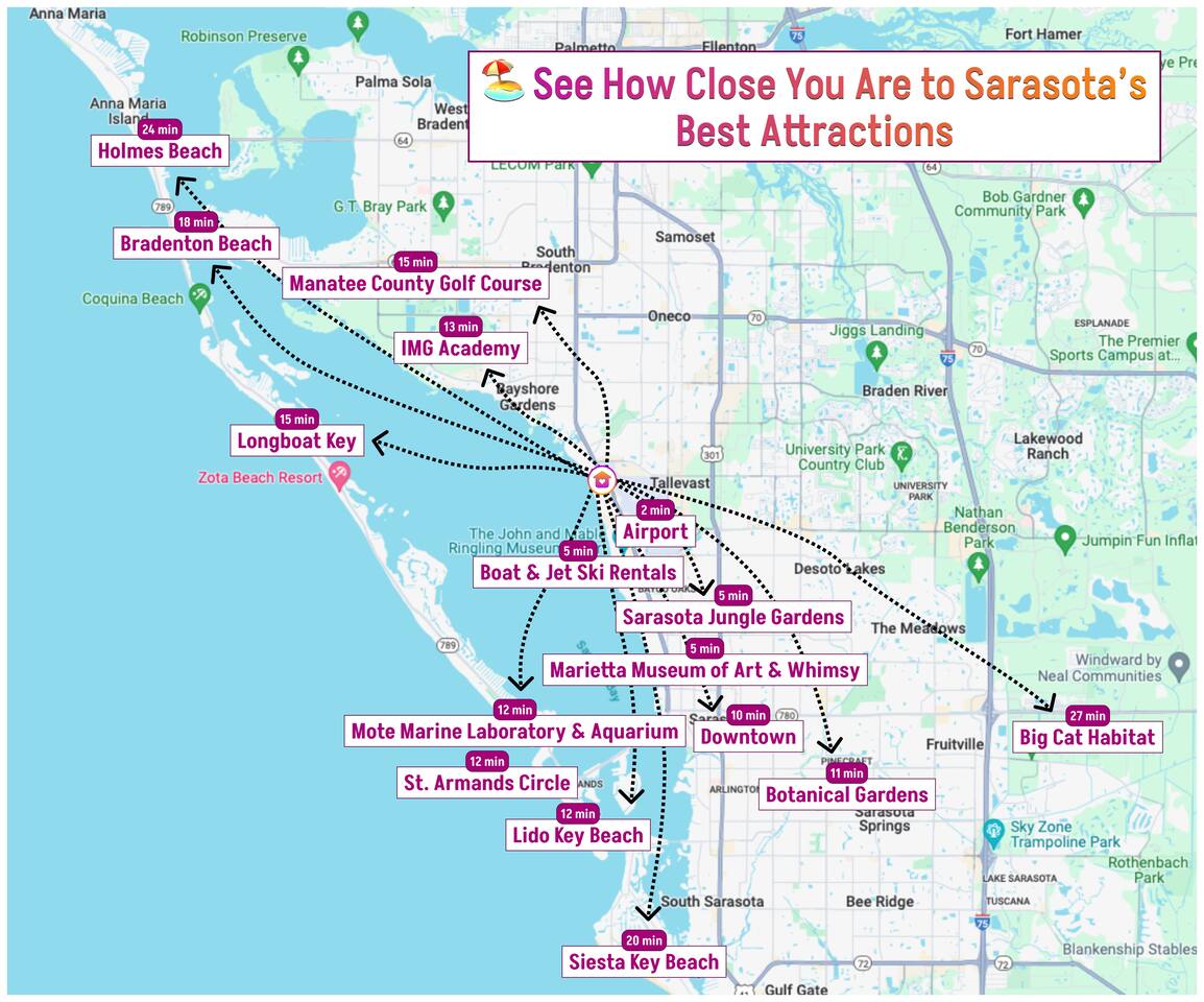 We're located in the Whitfield States, one of the best neighborhoods in Sarasota, FL. This neighborhood is great for an early walk with your kid, or a late afternoon run by Sarasota Bay. The Sarasota Bay sunset is breathtaking!
