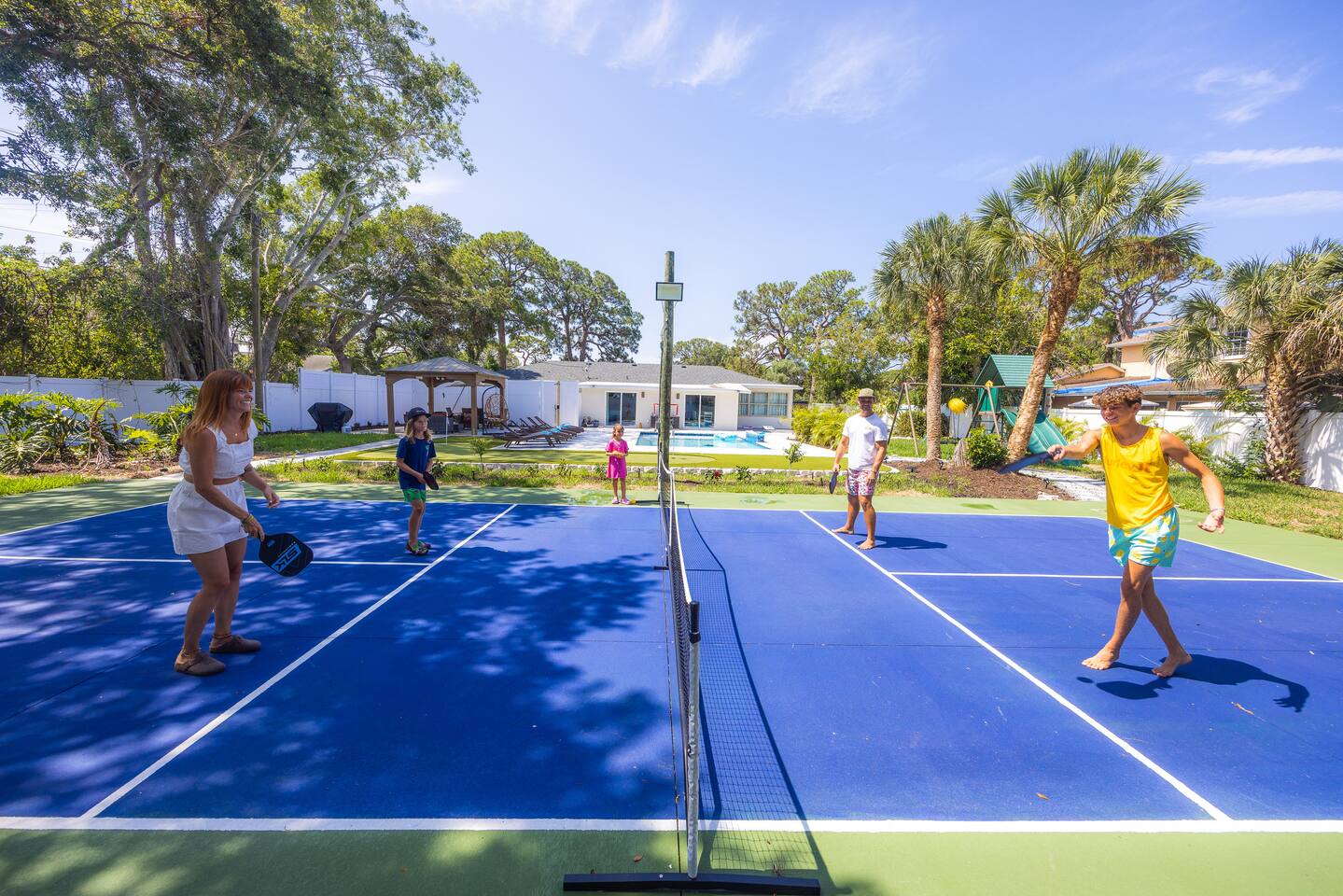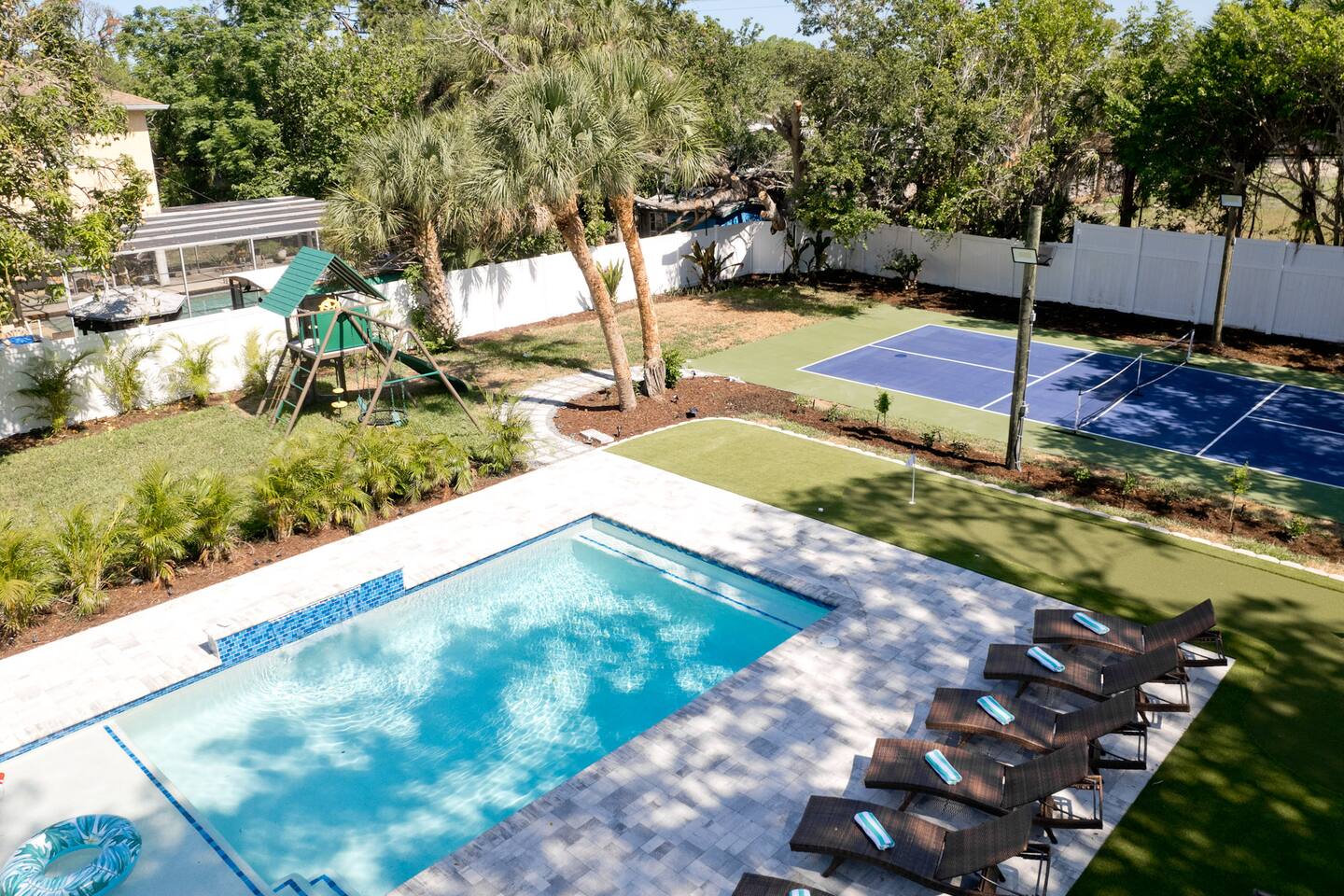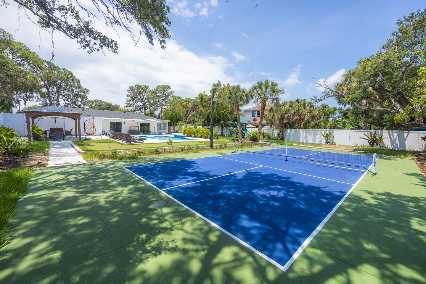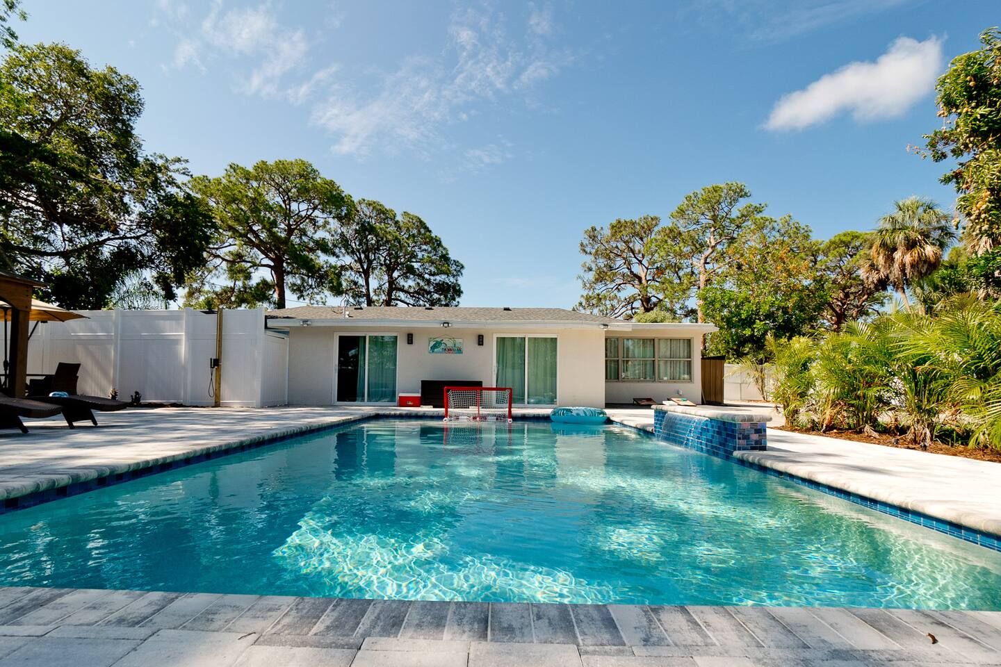 Luxurious 5-Bedroom Family Retreat with Heated Pool, Pickleball, and Mini-Golf | Near Siesta Key & Anna Maria Island Welcome to your Sarasota family getaway! This newly renovated 5-bedroom, 3-bath luxury home (2,400 sq ft) combines resort-style amenities, family-friendly comfort, and unbeatable proximity to downtown Sarasota, Siesta Key, Lido Key, and Anna Maria Island, some of Florida’s most iconic beaches. Whether you’re planning a beach escape, family reunion, or golf and pickleball retreat, this property offers everything you need for the ultimate Florida vacation. ➞ WHAT YOU’LL LOVE ABOUT THIS HOME • Sleeps up to 16 guests (12 adults + 4 kids) across 5 bedrooms and 3 bathrooms • Private heated pool, pickleball court, and mini-golf — your own backyard resort • Coastal-modern design with spacious interiors and stylish finishes • Fully stocked chef’s kitchen with stainless steel appliances and island seating • Game room with PlayStation 5, pool table, ping pong, fun for all ages • Outdoor oasis featuring gazebo, grill, outdoor shower, and comfortable lounge seating • Family-friendly amenities including Pack ’n Play, stroller, and highchair • Fast Wi-Fi + Smart TVs with Roku, Netflix, and Disney+ in every room • Washer & dryer for your convenience • Free parking for up to 5 (small) cars available on-site ➞ LOCATION • Sarasota–Bradenton International Airport – 3 miles (7 min) • Downtown Sarasota – 7 miles (15 min) • Siesta Key Beach – 17 miles (30 min) • Anna Maria Island – 14 miles (25 min) • Lido Key Beach – 8 miles (18 min) • The Ringling Museum of Art – 4 miles (8 min) • Garden of Ancient Statues – 4 miles (8 min) • IMG Academy – 13 miles (20 min) • Marietta Museum of Art & Whimsy – 6 miles (12 min) ➞ WHERE YOU’LL SLEEP Each bedroom is designed for comfort and relaxation, with Smart TVs, workspaces, and quality linens. • Bedroom 1: King bed · Ensuite bath · Smart TV · Work desk • Bedroom 2: Full-over-full bunk w/ twin trundle (perfect for kids) • Bedroom 3: King bed · Smart TV · Work desk • Bedroom 4: Queen bed · Ensuite bath · Smart TV · Work desk • Bedroom 5: King bed · Smart TV • Living Room: Queen sleeper sofa • Gaming Room: Queen sleeper sofa ✔ Linens, bath towels, and pool towels provided for all guests. ➞ WHAT GUEST ARE SAYING ABOUT THIS PROPERTY: “Great place to stay in Sarasota and a quick driving distance to some of the best beaches nearby.” – Jabez “Home was clean and beautiful! We had such a great time with the backyard oasis!” – LuAnn “Amazing place! The backyard is truly amazing, and the house is just as gorgeous in person.” – Iris ➞ FULLY EQUIPPED KITCHEN Cook, dine, and entertain in a modern chef’s kitchen with all essentials: • Granite counters + island seating • Stainless steel appliances • Air fryer, blender, crockpot, toaster • Cookware, bakeware, adult & kids’ dinnerware • Flex Brew coffee maker + complimentary coffee, filters & creamer ➞ OUTDOOR OASIS Your private backyard resort awaits: • Large, heated pool (optional heating $30/day) • Mini-golf course • Private lighted pickleball & basketball court • Playground with swings & slides • Firepit for cozy evenings • Gazebo with sofa, dining table & lounge chairs • BBQ grill (propane provided) • Beach gear: chairs, umbrellas, wagon, & toys ➞ ULTIMATE GAME ROOM Bring the fun indoors with: • PlayStation 5 • Skee ball • Pool and ping pong table • Board games for all ages • 65” Smart TV for movies or gaming nights ➞ PETS WELCOME (WITH APPROVAL) We love hosting pets! • Pets are welcome with prior approval and a $175 pet fee • Certain breeds may have restrictions per insurance • Please keep pets off the furniture and out of the pool ➞ KID FRIENDLY COMFORTS We’ve got the little ones covered: • 1 Pack ’n Play with sheet • 1 Stroller • 1 Baby monitor • 1 Highchair • 1 Bassinet • Kids’ dinnerware set • Beach toys ➞ BEACH READY GEAR • 1 Wagon • 6 Beach chairs • 2 Umbrellas • 1 Sand-free beach mat • 1 Cooler • Beach towels provided for all guests (based on number of guests in your group) ➞ HOUSE RULES • No parties, events, or loud gatherings (strictly enforced) • Quiet hours: 10 PM – 7 AM • No smoking indoors or in backyard • Guests under 26 must be part of a family group • Max 5 cars (driveway only – no street or lawn parking) • Contactless check-in may require ID verification Your Private Sarasota Resort Awaits From sunrise pickleball matches to sunset swims and family mini-golf games, this home brings the resort experience right to your doorstep. Perfect for families, groups, or anyone seeking a luxury coastal retreat near Florida’s most beautiful beaches. ★☆ Book Your Stay Today & Experience Sarasota Like Never Before! ☆★