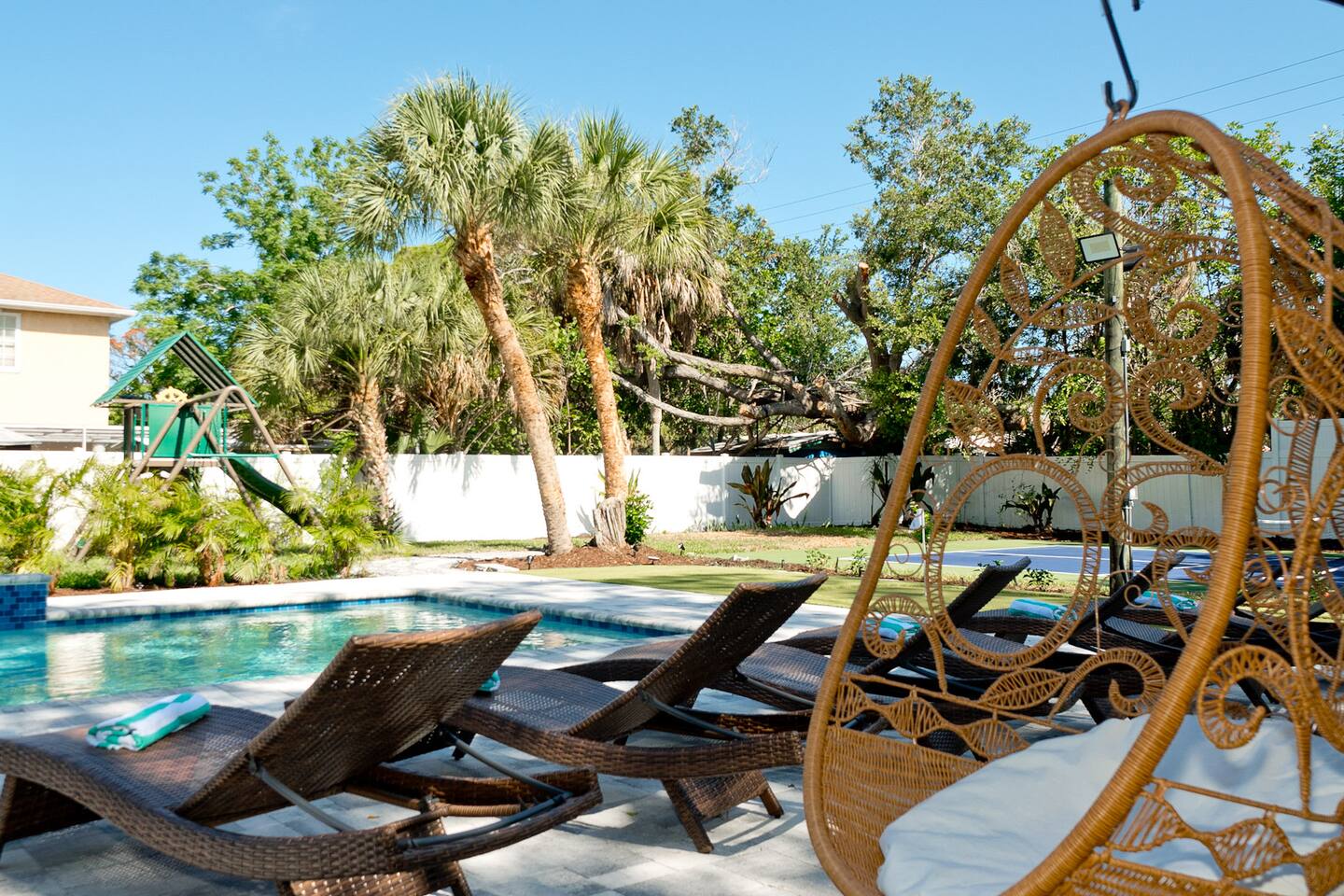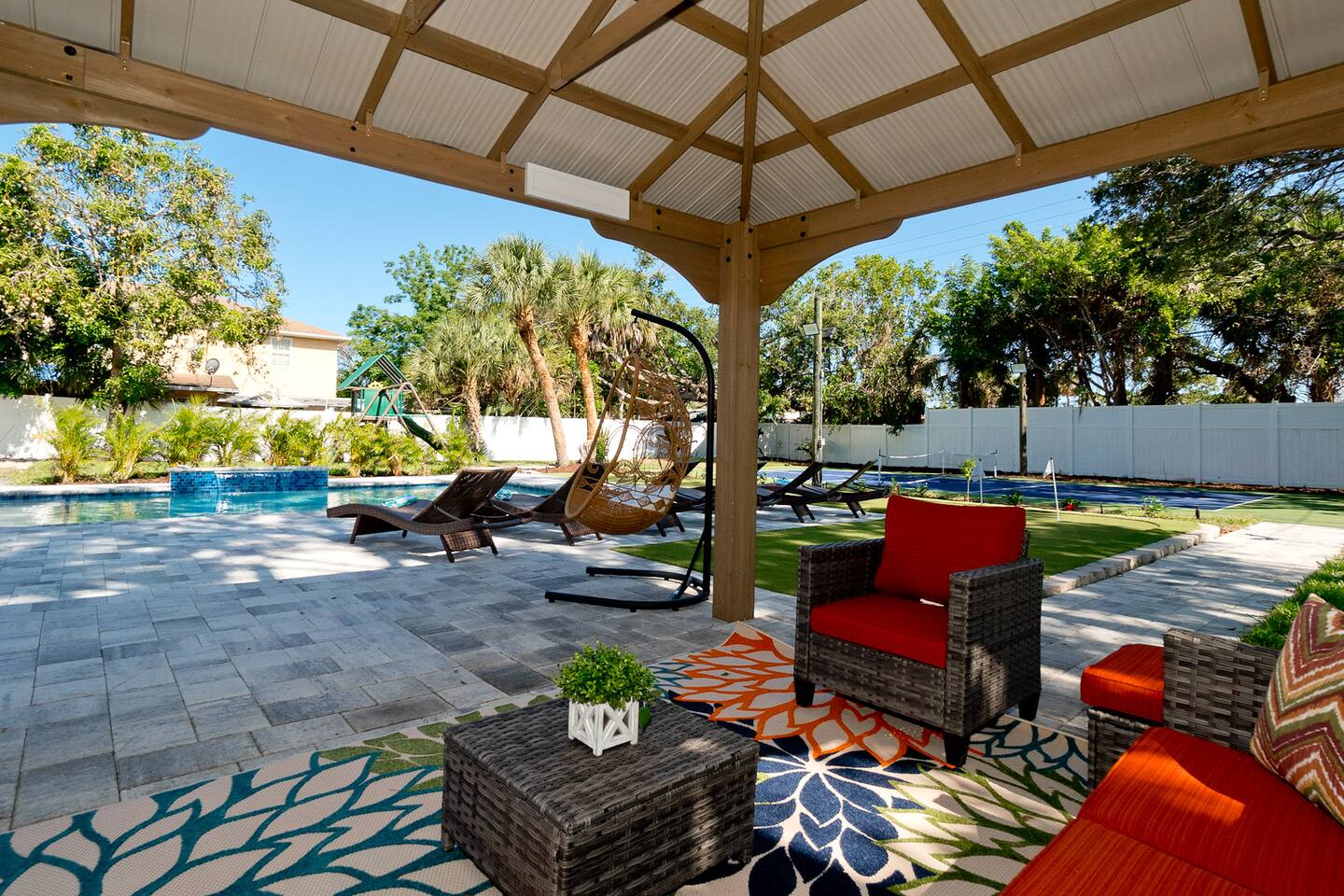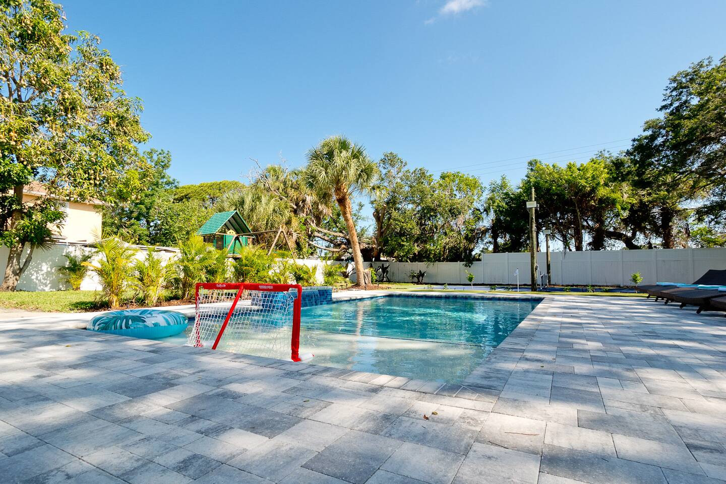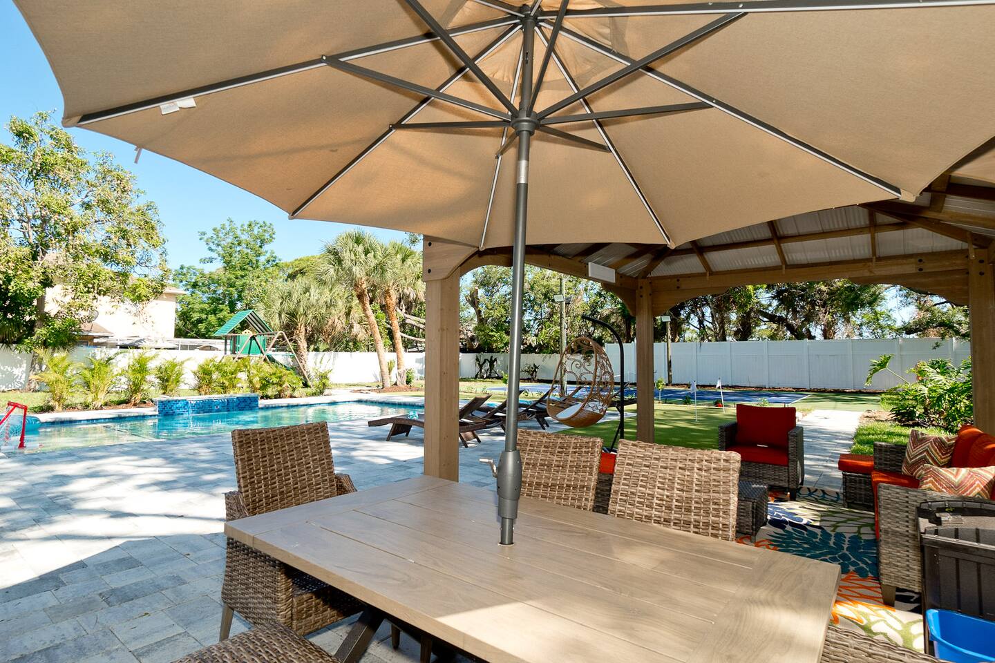 Luxurious 5-Bedroom Family Retreat with Heated Pool, Pickleball, and Mini-Golf | Near Siesta Key & Anna Maria Island Welcome to your Sarasota family getaway! This newly renovated 5-bedroom, 3-bath luxury home (2,400 sq ft) combines resort-style amenities, family-friendly comfort, and unbeatable proximity to downtown Sarasota, Siesta Key, Lido Key, and Anna Maria Island, some of Florida’s most iconic beaches. Whether you’re planning a beach escape, family reunion, or golf and pickleball retreat, this property offers everything you need for the ultimate Florida vacation. ➞ WHAT YOU’LL LOVE ABOUT THIS HOME • Sleeps up to 16 guests (12 adults + 4 kids) across 5 bedrooms and 3 bathrooms • Private heated pool, pickleball court, and mini-golf — your own backyard resort • Coastal-modern design with spacious interiors and stylish finishes • Fully stocked chef’s kitchen with stainless steel appliances and island seating • Game room with PlayStation 5, pool table, ping pong, fun for all ages • Outdoor oasis featuring gazebo, grill, outdoor shower, and comfortable lounge seating • Family-friendly amenities including Pack ’n Play, stroller, and highchair • Fast Wi-Fi + Smart TVs with Roku, Netflix, and Disney+ in every room • Washer & dryer for your convenience • Free parking for up to 5 (small) cars available on-site ➞ LOCATION • Sarasota–Bradenton International Airport – 3 miles (7 min) • Downtown Sarasota – 7 miles (15 min) • Siesta Key Beach – 17 miles (30 min) • Anna Maria Island – 14 miles (25 min) • Lido Key Beach – 8 miles (18 min) • The Ringling Museum of Art – 4 miles (8 min) • Garden of Ancient Statues – 4 miles (8 min) • IMG Academy – 13 miles (20 min) • Marietta Museum of Art & Whimsy – 6 miles (12 min) ➞ WHERE YOU’LL SLEEP Each bedroom is designed for comfort and relaxation, with Smart TVs, workspaces, and quality linens. • Bedroom 1: King bed · Ensuite bath · Smart TV · Work desk • Bedroom 2: Full-over-full bunk w/ twin trundle (perfect for kids) • Bedroom 3: King bed · Smart TV · Work desk • Bedroom 4: Queen bed · Ensuite bath · Smart TV · Work desk • Bedroom 5: King bed · Smart TV • Living Room: Queen sleeper sofa • Gaming Room: Queen sleeper sofa ✔ Linens, bath towels, and pool towels provided for all guests. ➞ WHAT GUEST ARE SAYING ABOUT THIS PROPERTY: “Great place to stay in Sarasota and a quick driving distance to some of the best beaches nearby.” – Jabez “Home was clean and beautiful! We had such a great time with the backyard oasis!” – LuAnn “Amazing place! The backyard is truly amazing, and the house is just as gorgeous in person.” – Iris ➞ FULLY EQUIPPED KITCHEN Cook, dine, and entertain in a modern chef’s kitchen with all essentials: • Granite counters + island seating • Stainless steel appliances • Air fryer, blender, crockpot, toaster • Cookware, bakeware, adult & kids’ dinnerware • Flex Brew coffee maker + complimentary coffee, filters & creamer ➞ OUTDOOR OASIS Your private backyard resort awaits: • Large, heated pool (optional heating $30/day) • Mini-golf course • Private lighted pickleball & basketball court • Playground with swings & slides • Firepit for cozy evenings • Gazebo with sofa, dining table & lounge chairs • BBQ grill (propane provided) • Beach gear: chairs, umbrellas, wagon, & toys ➞ ULTIMATE GAME ROOM Bring the fun indoors with: • PlayStation 5 • Skee ball • Pool and ping pong table • Board games for all ages • 65” Smart TV for movies or gaming nights ➞ PETS WELCOME (WITH APPROVAL) We love hosting pets! • Pets are welcome with prior approval and a $175 pet fee • Certain breeds may have restrictions per insurance • Please keep pets off the furniture and out of the pool ➞ KID FRIENDLY COMFORTS We’ve got the little ones covered: • 1 Pack ’n Play with sheet • 1 Stroller • 1 Baby monitor • 1 Highchair • 1 Bassinet • Kids’ dinnerware set • Beach toys ➞ BEACH READY GEAR • 1 Wagon • 6 Beach chairs • 2 Umbrellas • 1 Sand-free beach mat • 1 Cooler • Beach towels provided for all guests (based on number of guests in your group) ➞ HOUSE RULES • No parties, events, or loud gatherings (strictly enforced) • Quiet hours: 10 PM – 7 AM • No smoking indoors or in backyard • Guests under 26 must be part of a family group • Max 5 cars (driveway only – no street or lawn parking) • Contactless check-in may require ID verification Your Private Sarasota Resort Awaits From sunrise pickleball matches to sunset swims and family mini-golf games, this home brings the resort experience right to your doorstep. Perfect for families, groups, or anyone seeking a luxury coastal retreat near Florida’s most beautiful beaches. ★☆ Book Your Stay Today & Experience Sarasota Like Never Before! ☆★