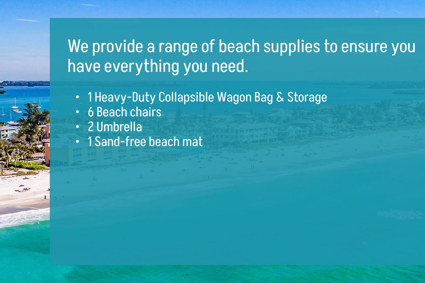 - Beach essentials Beach towels, umbrella, beach blanket, snorkeling gear
