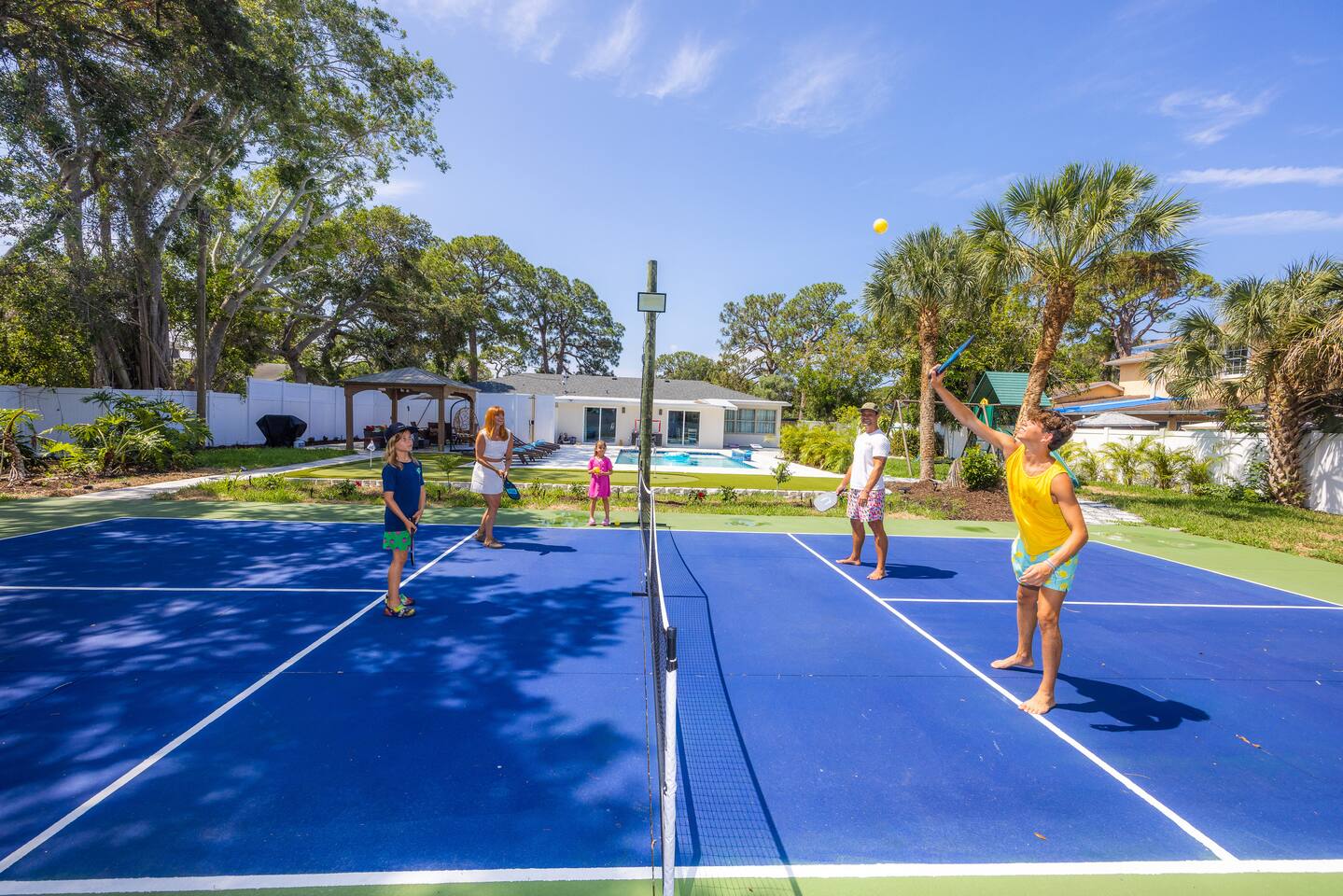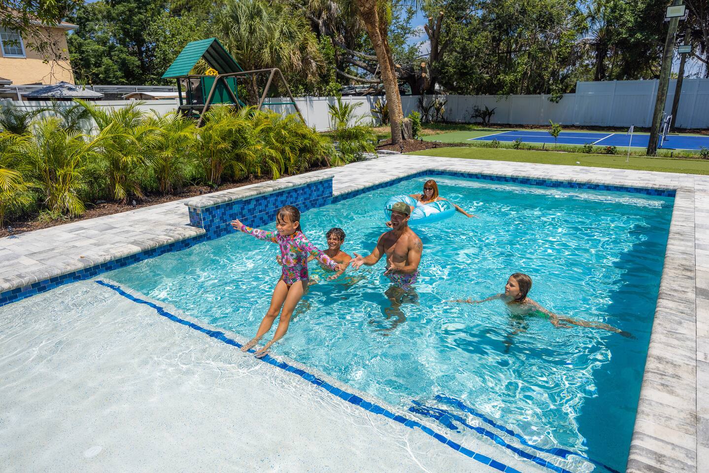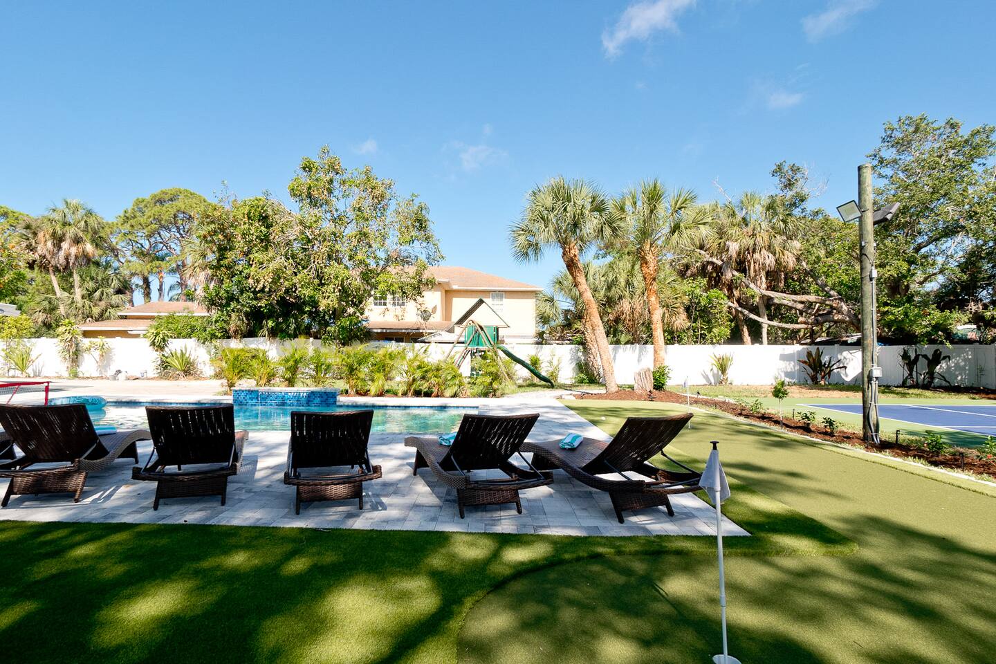 Resort-style Sarasota retreat with private heated pool, pickleball and basketball courts, mini-golf, fire pit, game room, outdoor lounge, and space for up to 16 guests perfect for families, reunions, and group getaways just minutes from beaches, dining, and top attractions. Book your stay today and enjoy luxury, entertainment, and convenience all in one unforgettable Sarasota getaway!